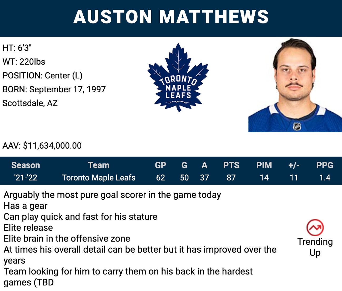 Auston Matthews Stats 202324? NHL Career, Season, and Playoff Statistics , Find out auston matthews's latest linemates, game logs, advanced stats, player cards, news and analysis from dobberhockey.com